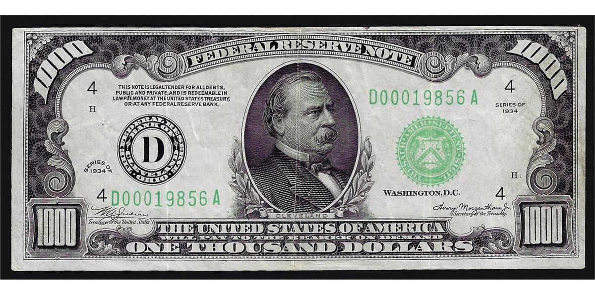 One 1934 $1000 Federal Reserve Note Cleveland.