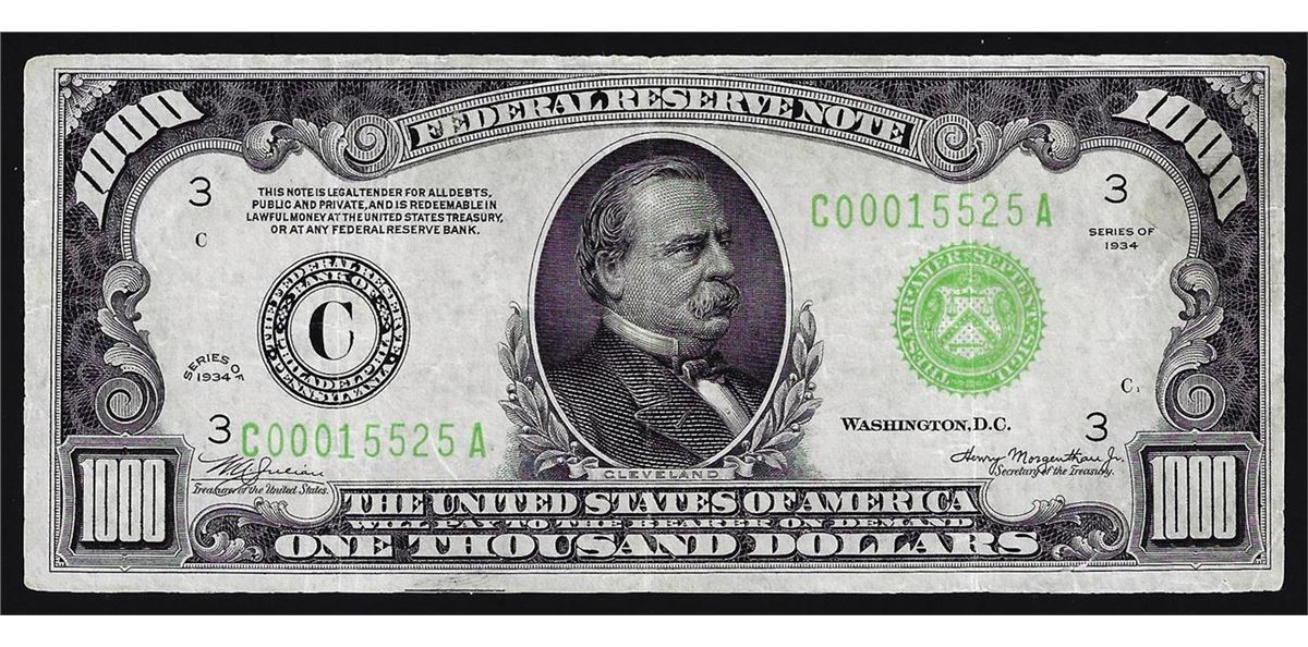 One 1934 $1000 Federal Reserve Note Philadelphia.