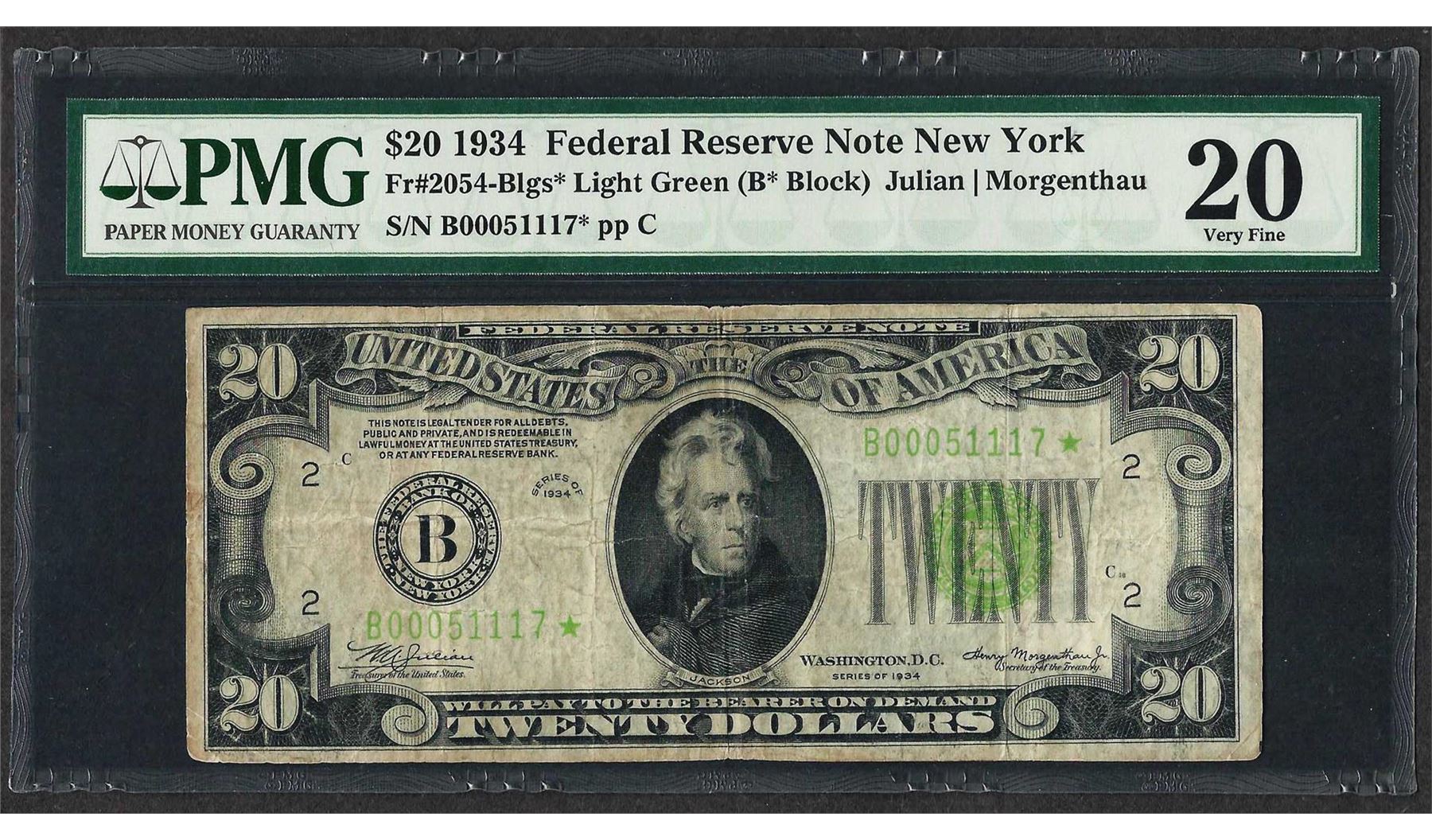 One 1934 $20 Federal Reserve STAR Note New York Light Green Seal PMG Very Fine 20. PMG Certified.