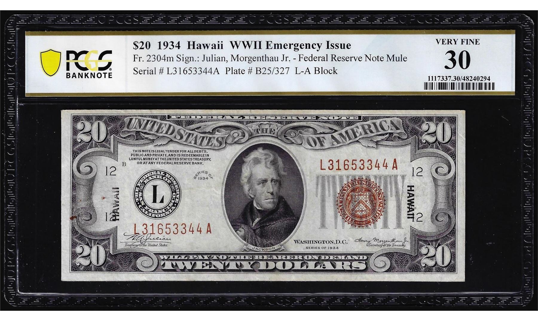 1934 $20 Hawaii WWII Emergency Issue Federal Reserve Note Fr.2304m PCGS Very Fine 30