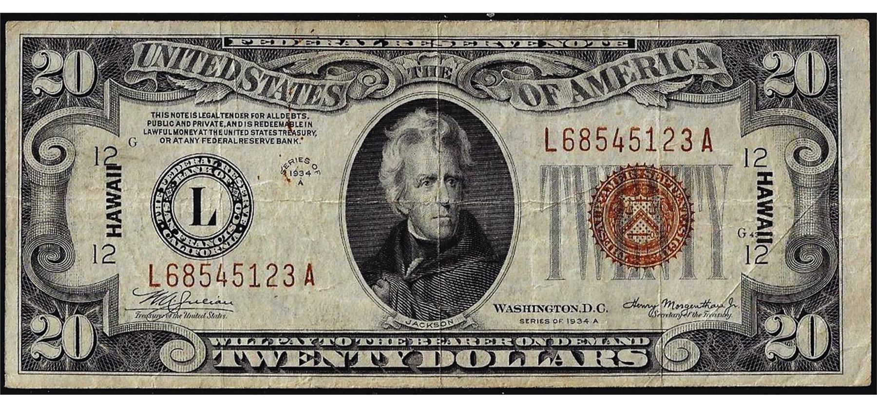 One 1934 $20 Hawaii WWII Emergency Issue Federal Reserve Note.