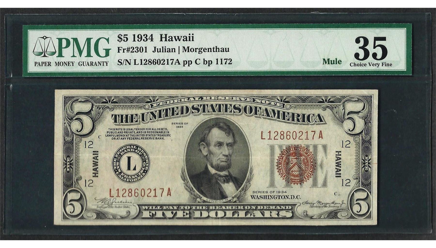 One 1934 $5 Hawaii Federal Reserve WWII Emergency Note Fr.2301 Mule PMG Choice Very Fine 35. PMG Certified.