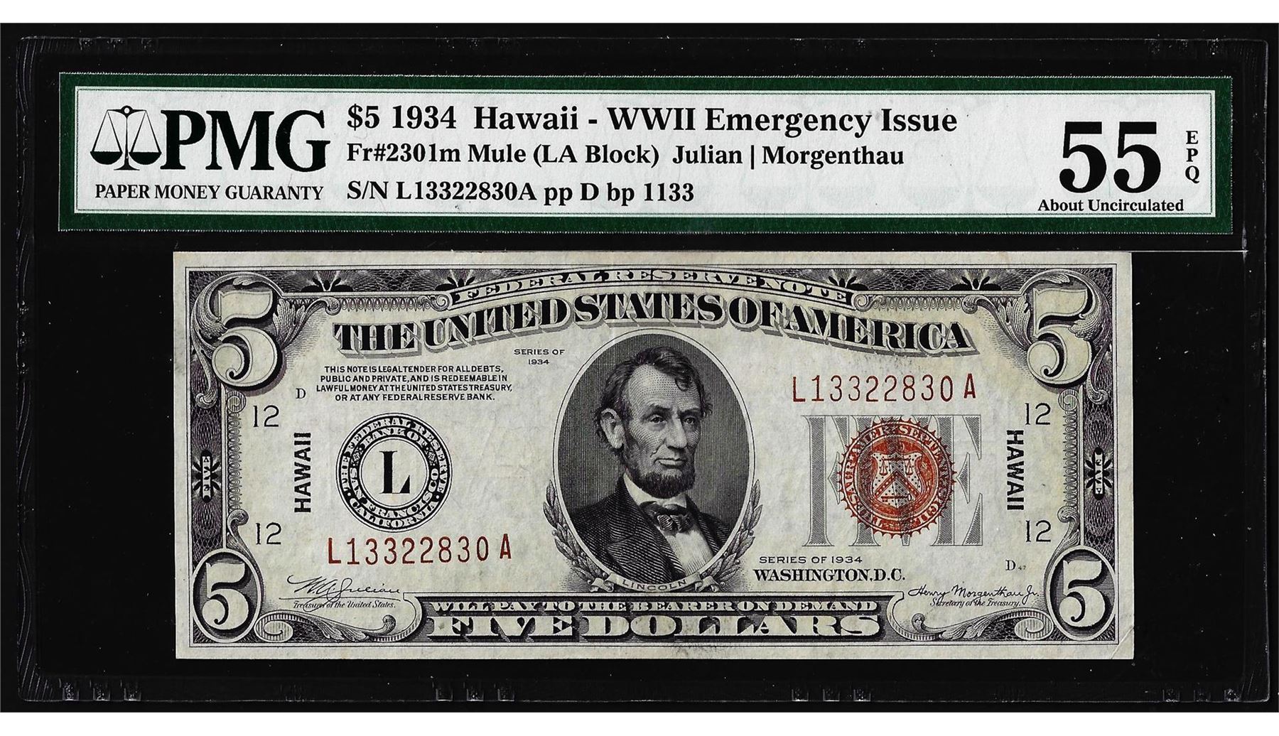 One 1934 $5 Hawaii WWII Emergency Issue Federal Reserve Note Fr.2301m PMG About Unc. 55EPQ. PMG Certified.