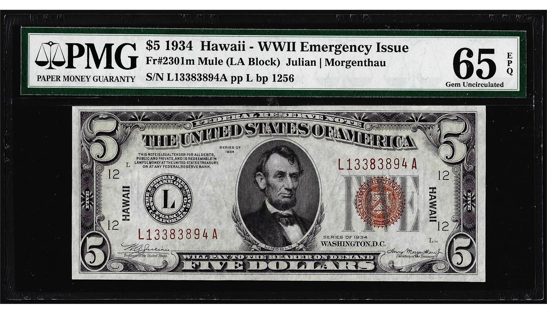 One 1934 $5 Hawaii WWII Emergency Issue Federal Reserve Note PMG Gem Uncirculated 65EPQ. PMG Certified.