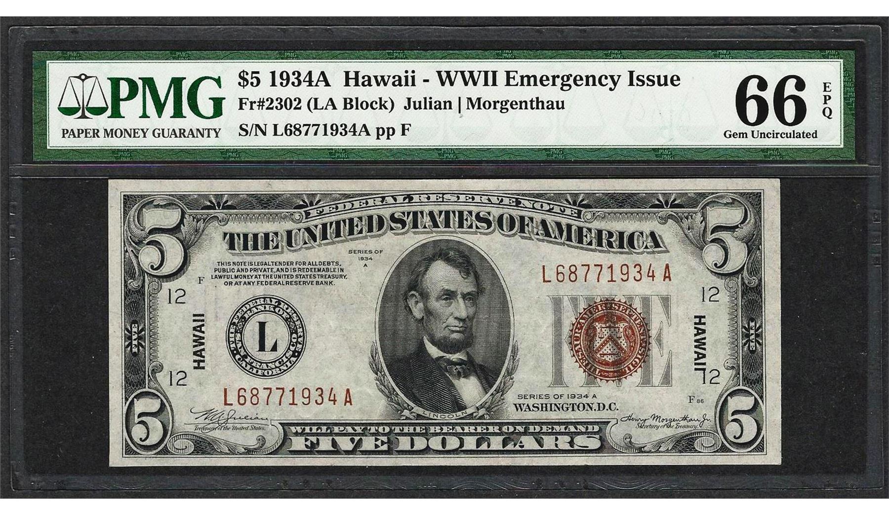 One 1934 $5 Hawaii WWII Emergency Issue Federal Reserve Note PMG Gem Uncirculated 66EPQ. PMG Certified.