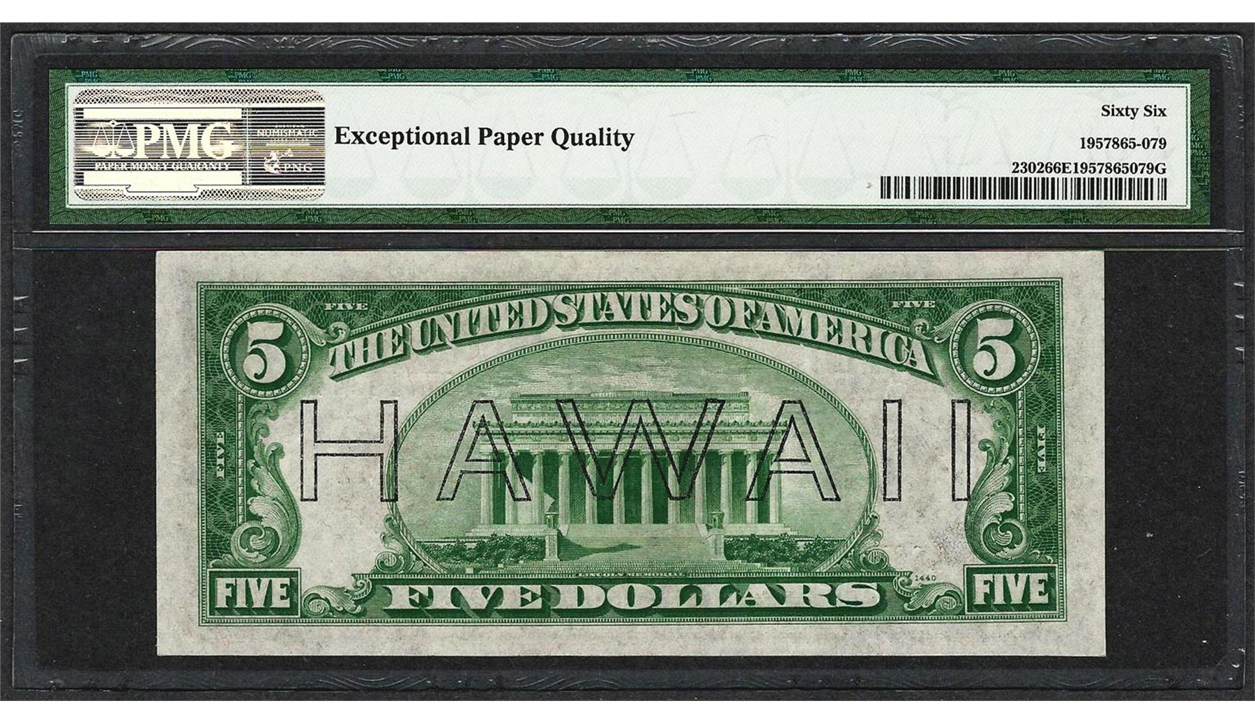1934 $5 Hawaii WWII Emergency Issue Federal Reserve Note PMG Gem Uncirculated 66EPQ