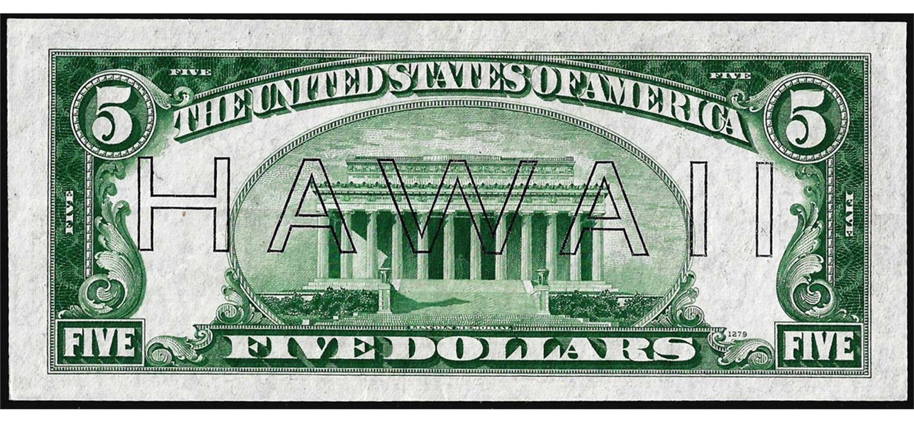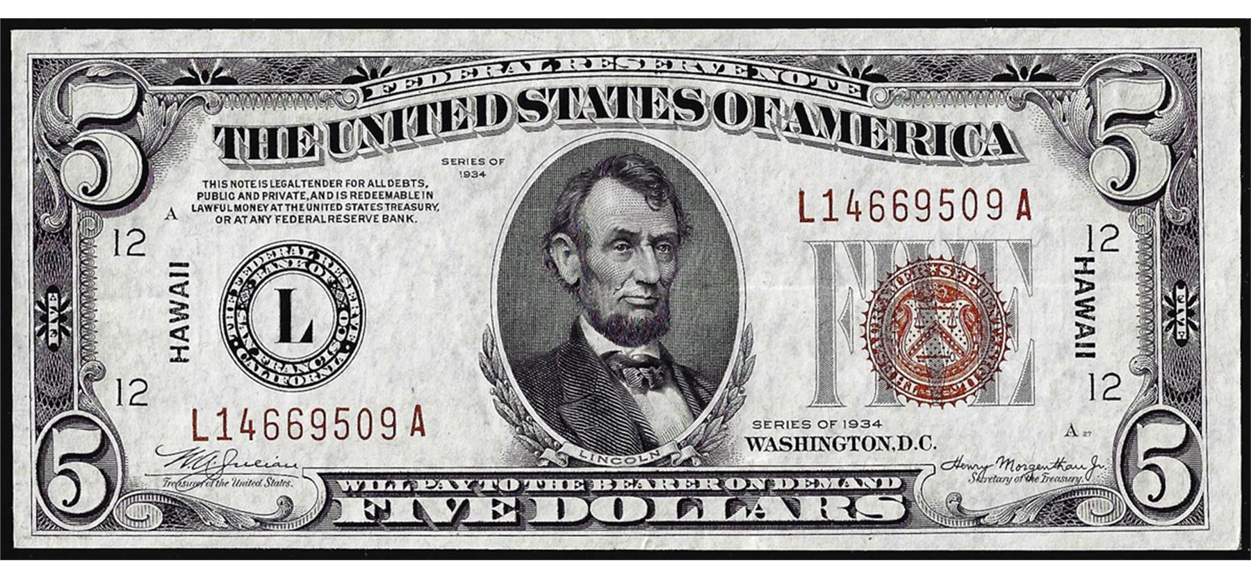 One 1934 $5 Hawaii WWII Emergency Issue Federal Reserve Note.