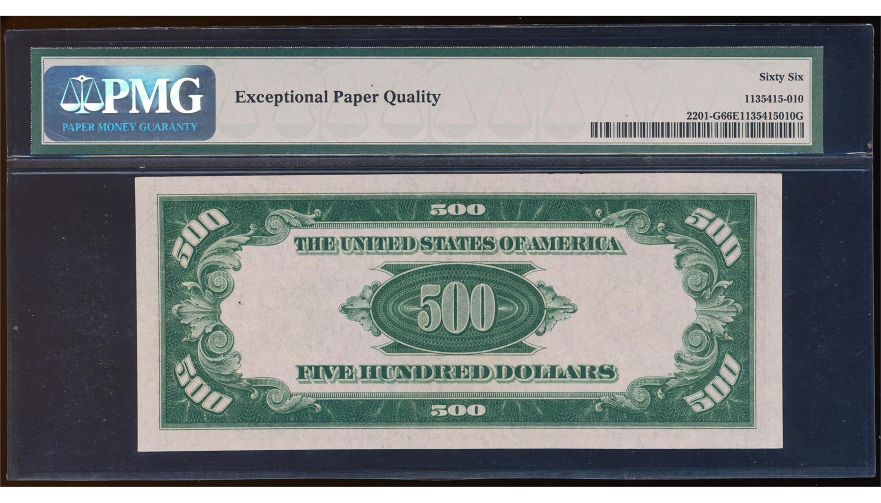 One 1934 $500 Federal Reserve Note Chicago Light Green Seal PMG Gem Uncirculated 66EPQ. PMG Certified.