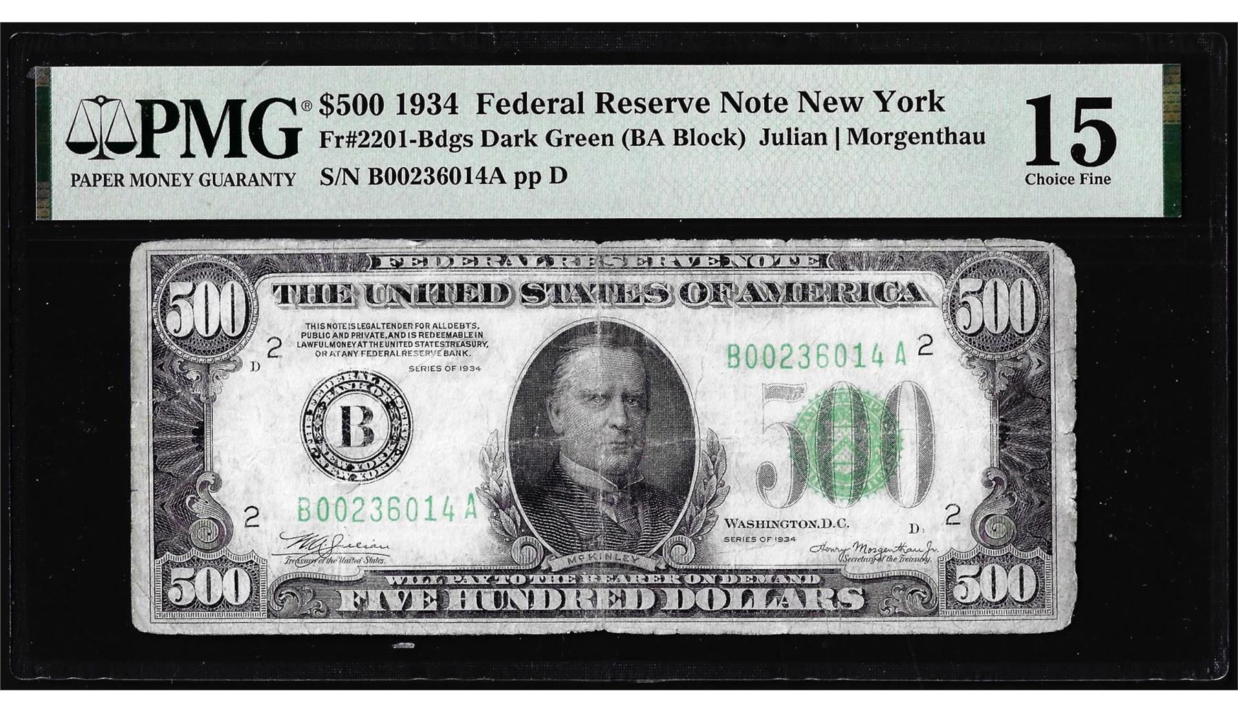 One 1934 $500 Federal Reserve Note New York Fr.2201-B PMG Choice Fine 15. PMG Certified.