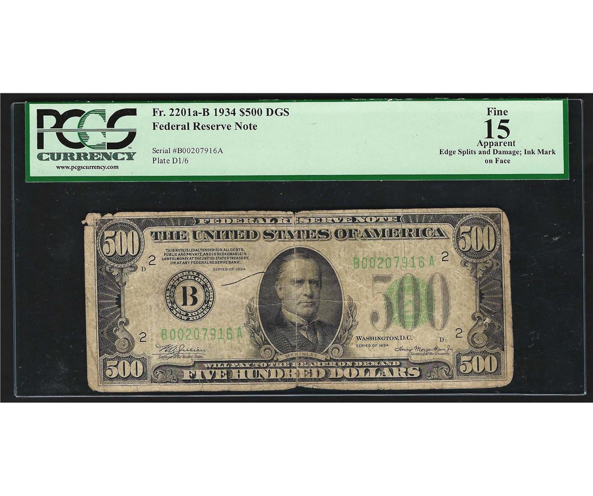 One 1934 $500 Federal Reserve Note New York PCGS F15 Apparent. PCGS Graded.