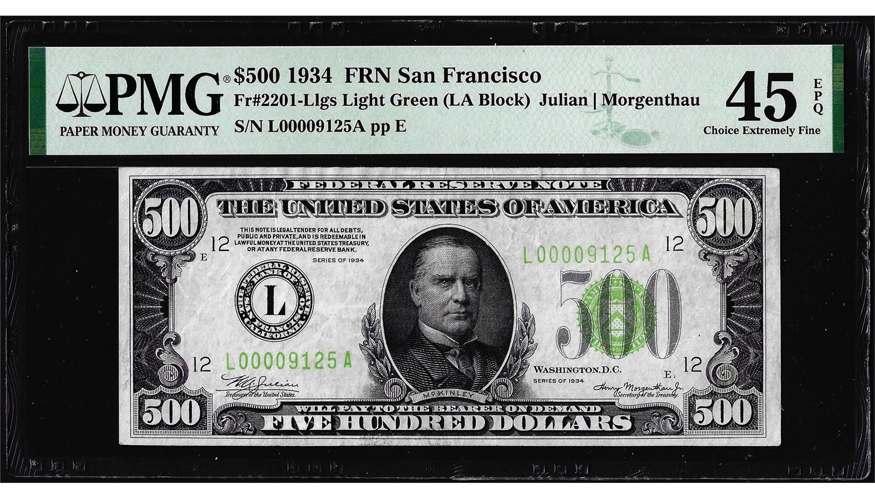 One 1934 $500 Federal Reserve Note San Francisco PMG Choice XF45EPQ Light Green Seal. PMG Certified.