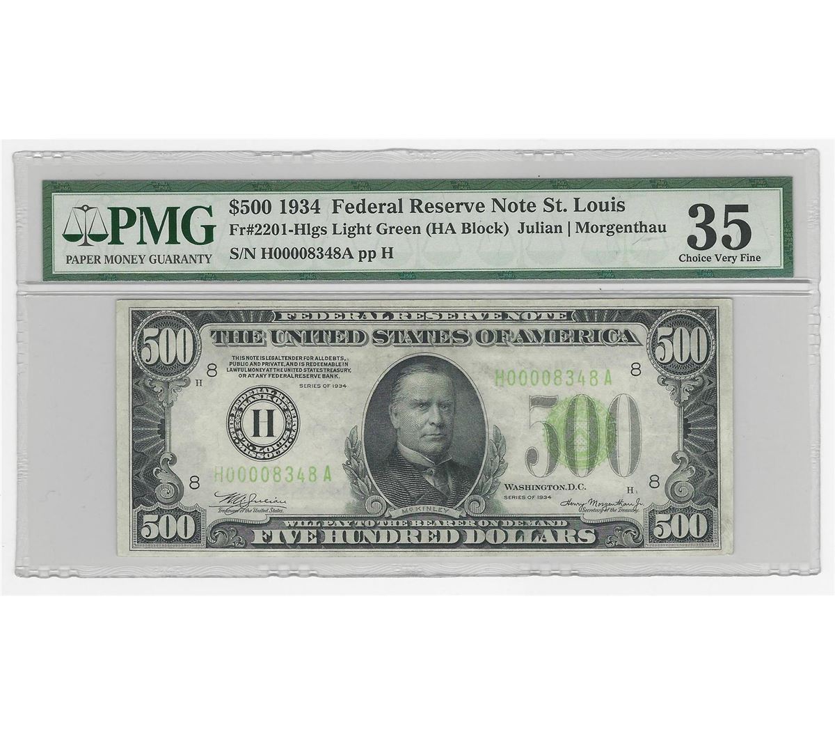 One 1934 $500 Federal Reserve Note St. Louis Light Green Block PMG Choice VF35. PMG Certified.