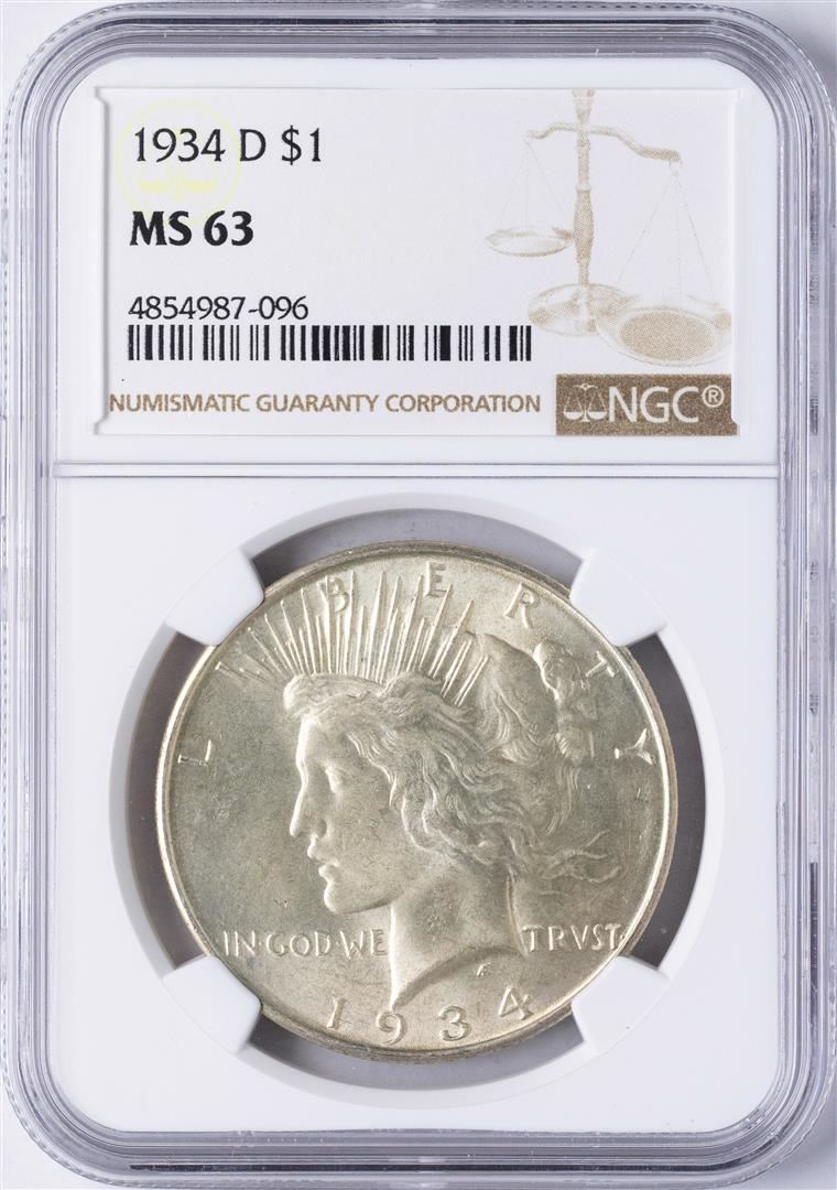 One 1934-D $1 Peace Silver Dollar Coin NGC MS63. NGC Certified.