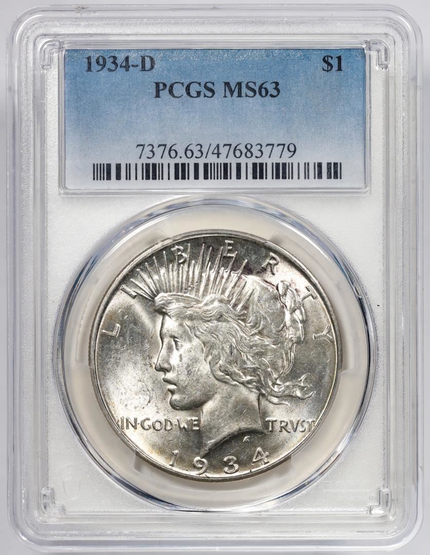 One 1934-D $1 Peace Silver Dollar Coin PCGS MS63. PCGS Graded.