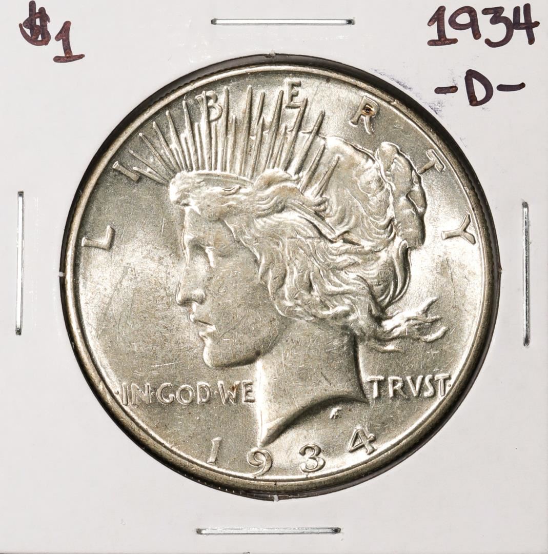 One 1934-D $1 Peace Silver Dollar Coin.