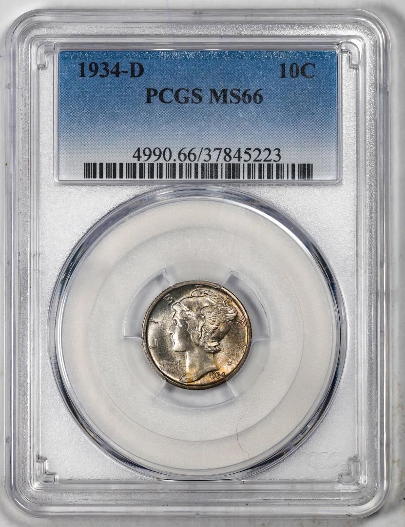 One 1934-D Mercury Dime Coin PCGS MS66. PCGS Graded.