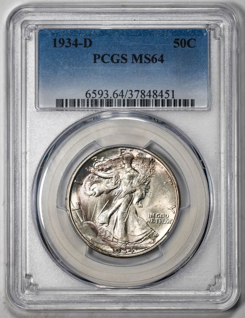 One 1934-D Walking Liberty Half Dollar Coin PCGS MS64. PCGS Graded.