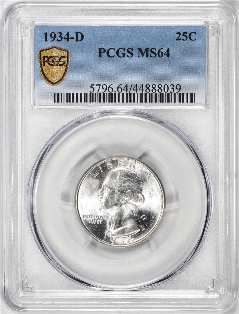 One 1934-D Washington Quarter Coin PCGS MS64. PCGS Graded.