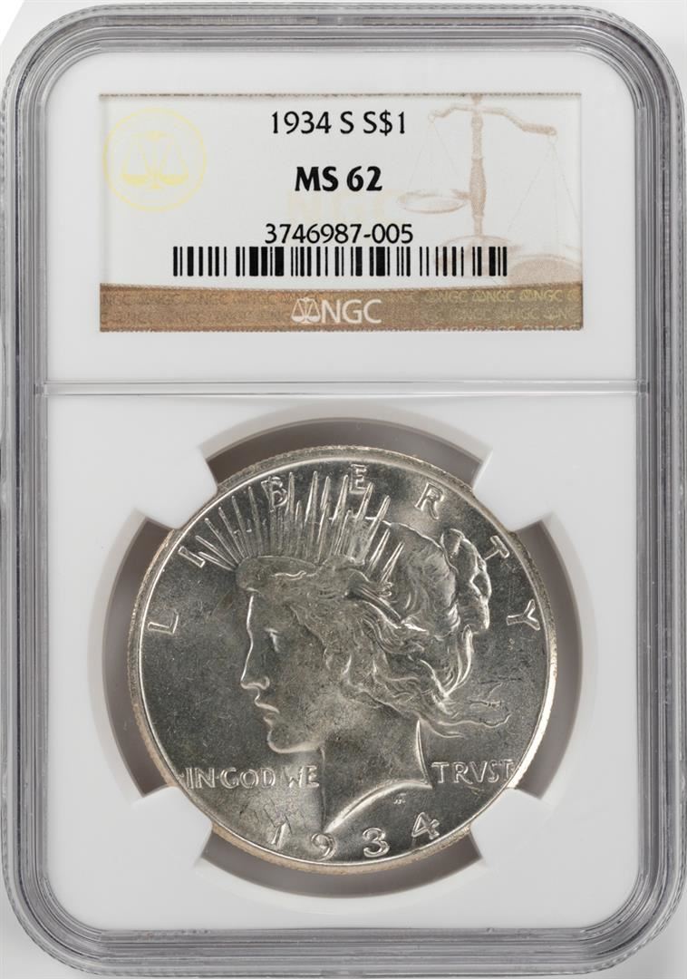 One 1934-S $1 Peace Silver Dollar Coin NGC MS62. NGC Certified.