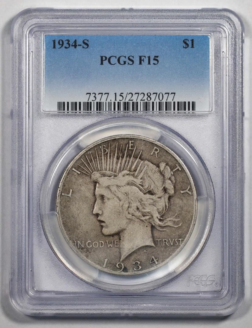 One 1934-S $1 Peace Silver Dollar Coin PCGS F15.