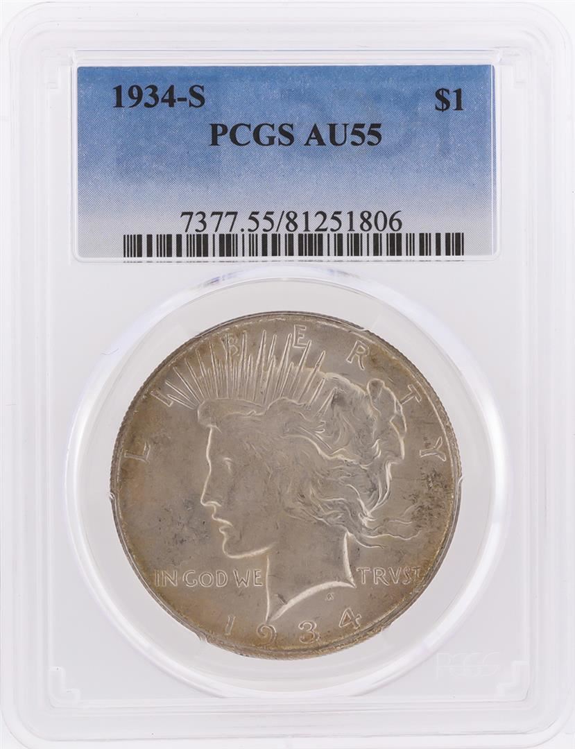 One 1934-S $1 Peace Silver Dollar Coin PCGS Graded AU55. PCGS Graded.