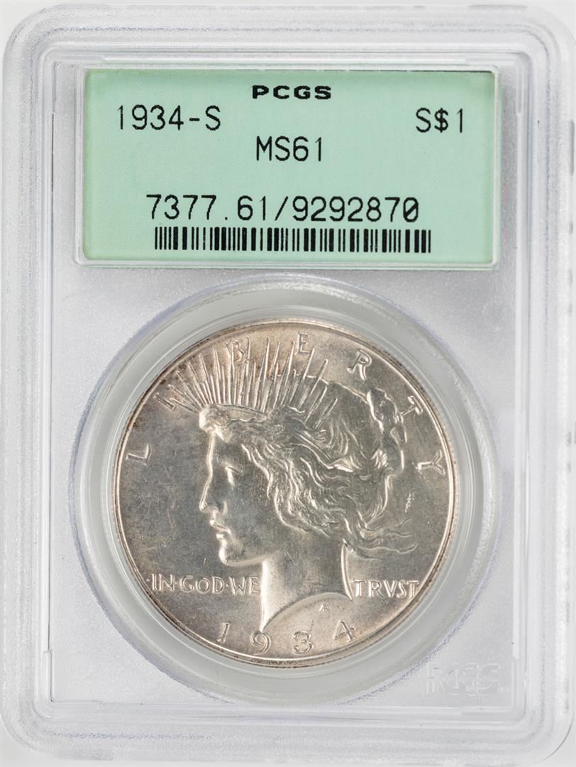 One 1934-S $1 Peace Silver Dollar Coin PCGS MS61 Old Green Holder. PCGS Graded.