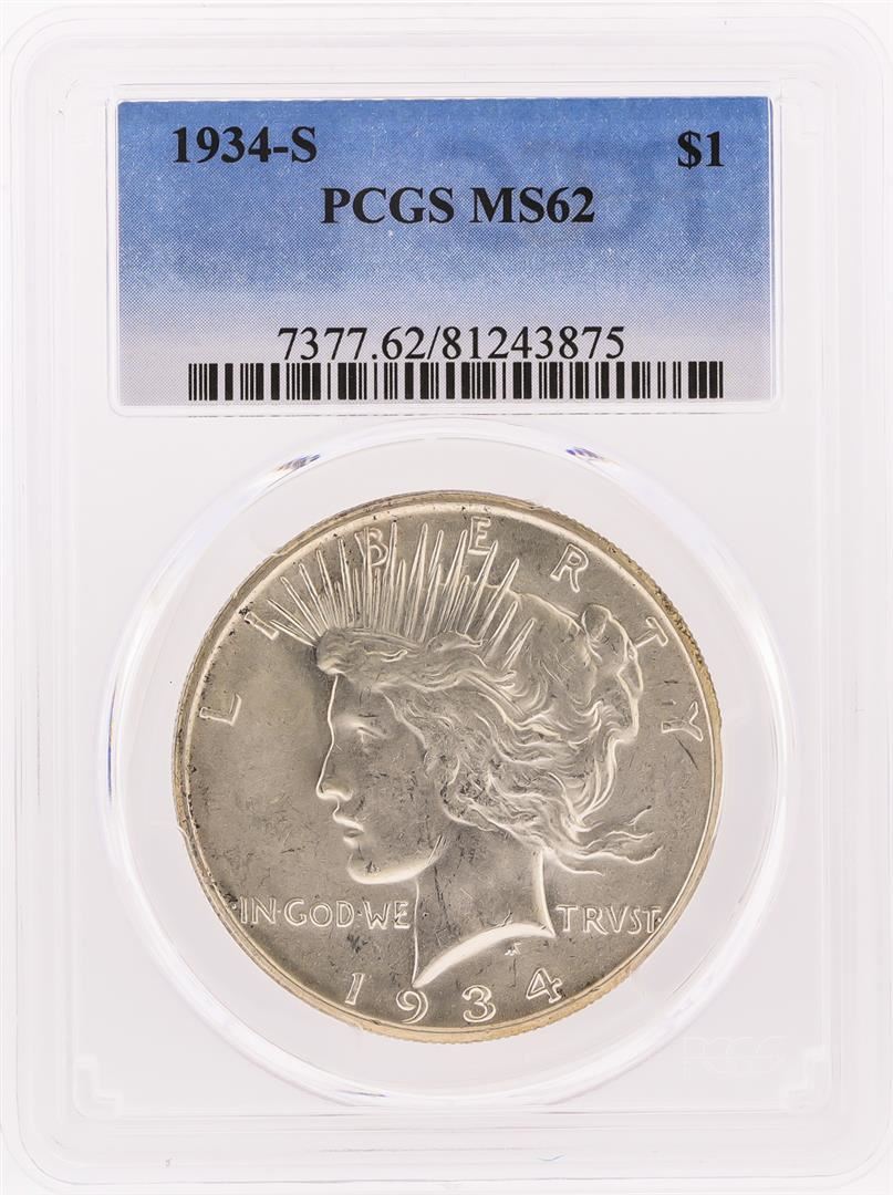 One 1934-S $1 Peace Silver Dollar Coin PCGS MS62. PCGS Graded.