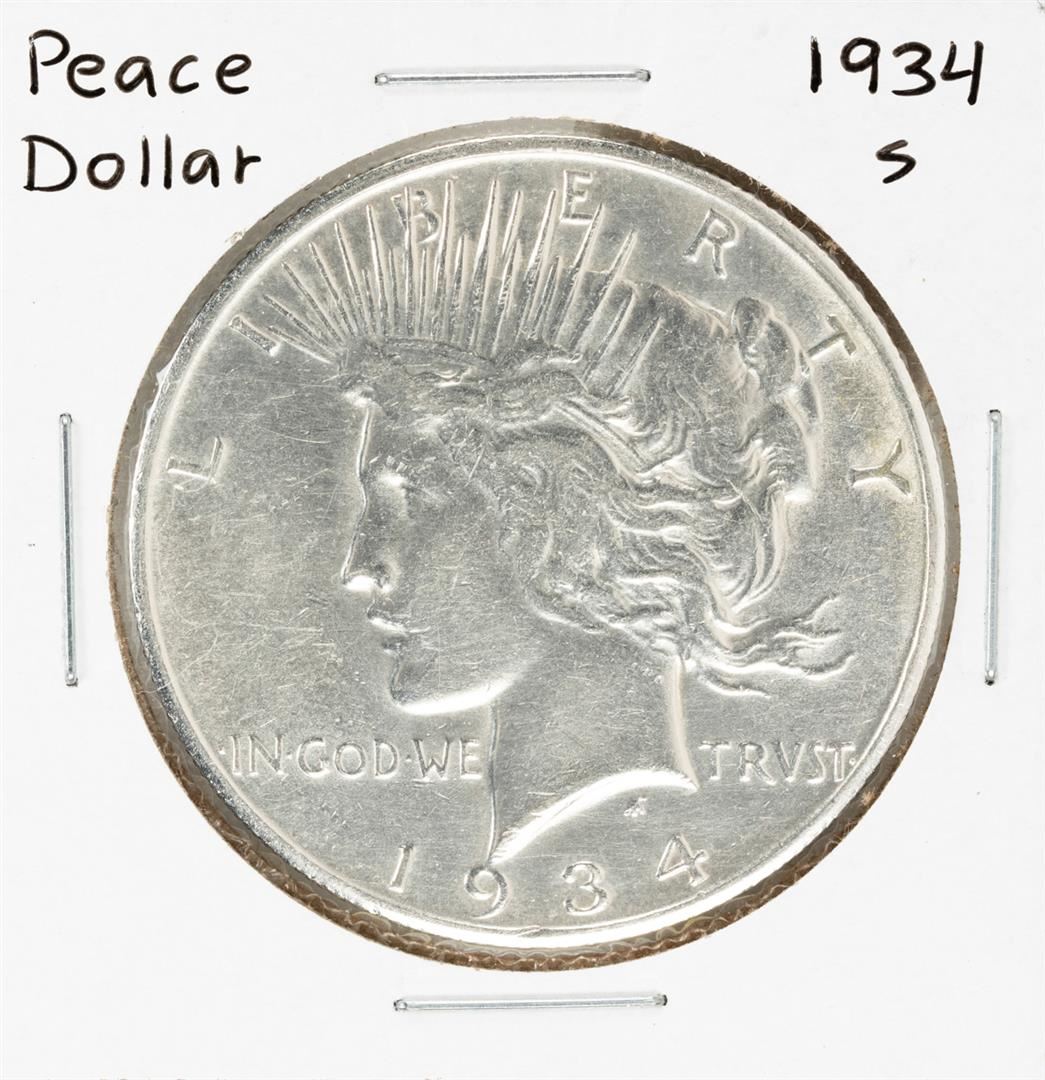 One 1934-S $1 Peace Silver Dollar Coin.