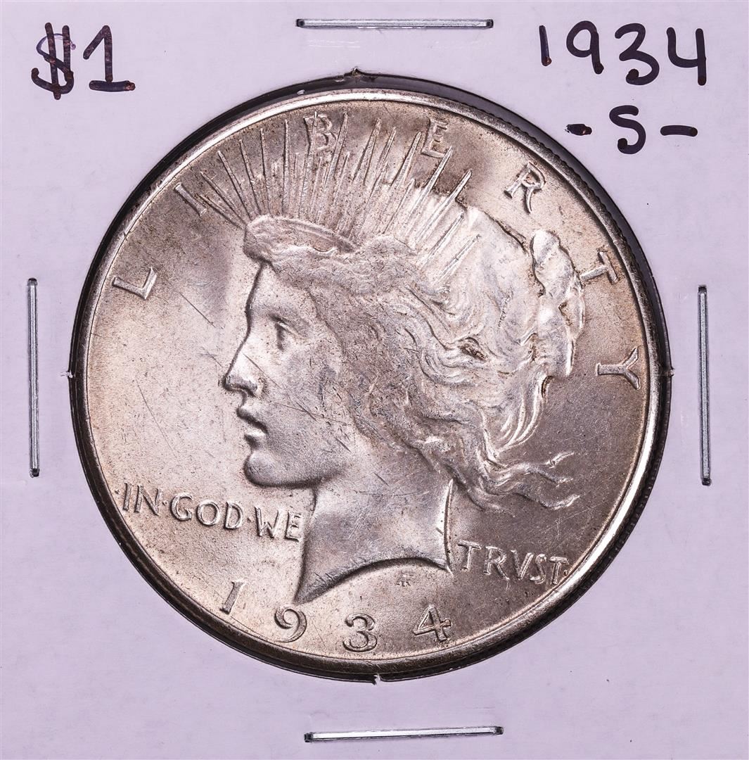 One 1934-S $1 Peace Silver Dollar Coin.