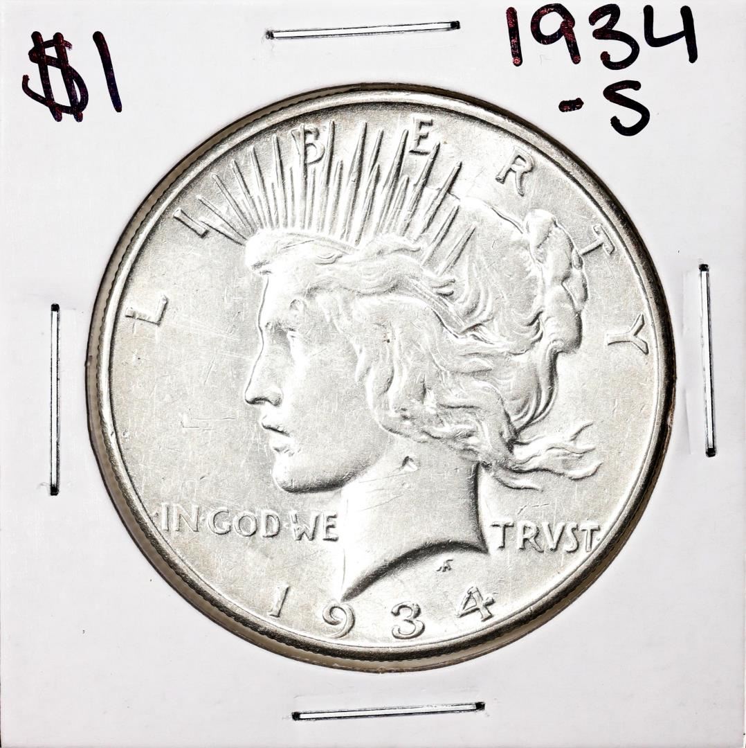 One 1934-S $1 Peace Silver Dollar Coin.