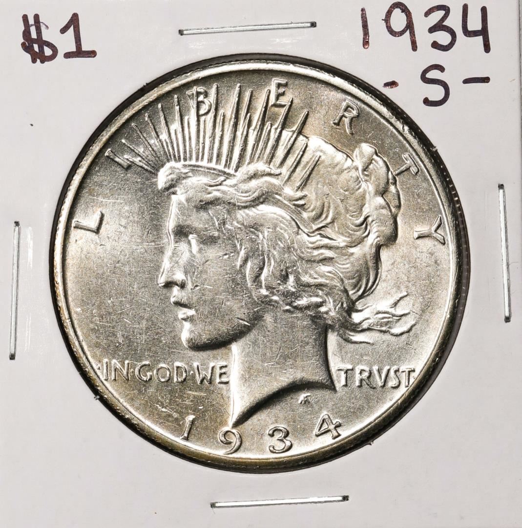One 1934-S $1 Peace Silver Dollar Coin.