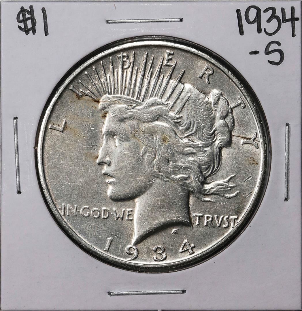 One 1934-S $1 Peace Silver Dollar Coin.