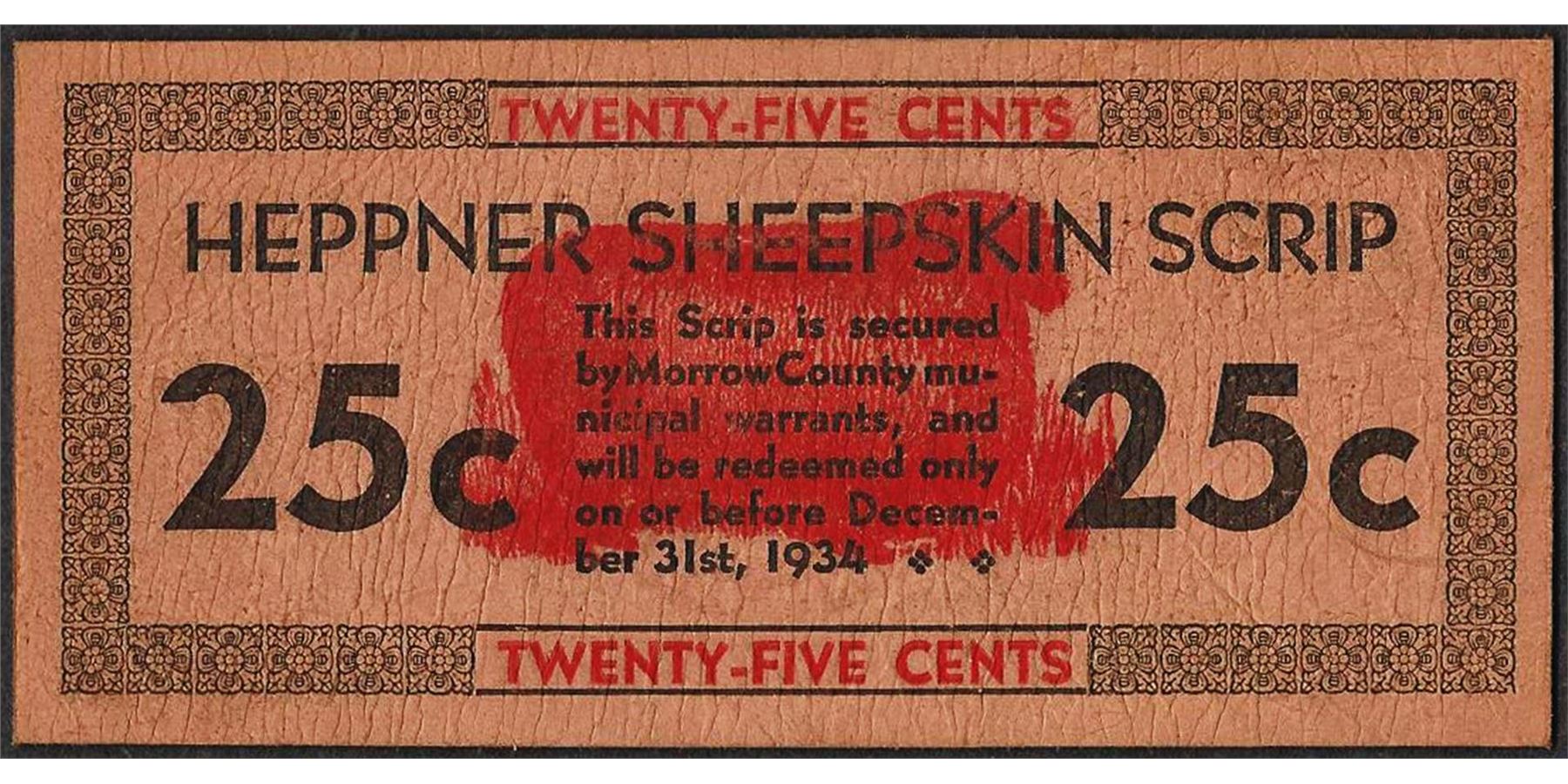 One 1934 Twenty-Five Cents Heppner Sheepskin Oregon Obsolete Scrip.