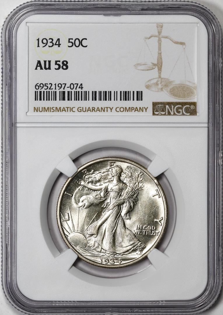 One 1934 Walking Liberty Half Dollar Coin NGC AU58. NGC Certified.
