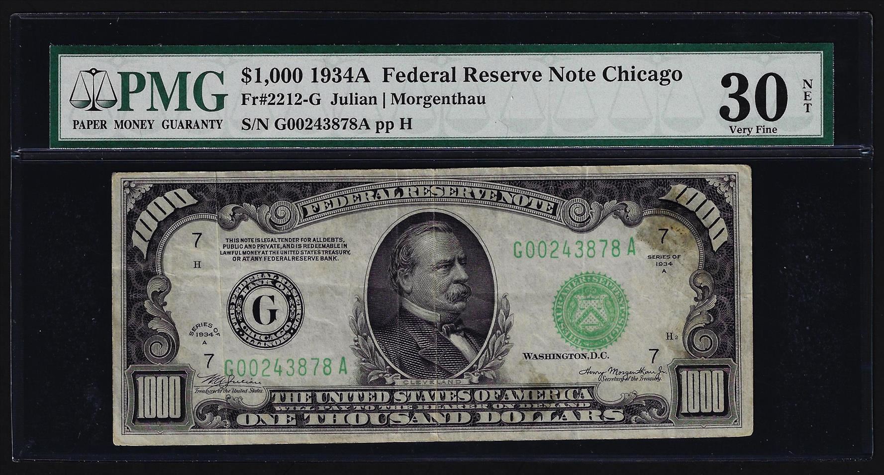 1934A $1,000 Federal Reserve Note Chicago PMG VF30 Net
