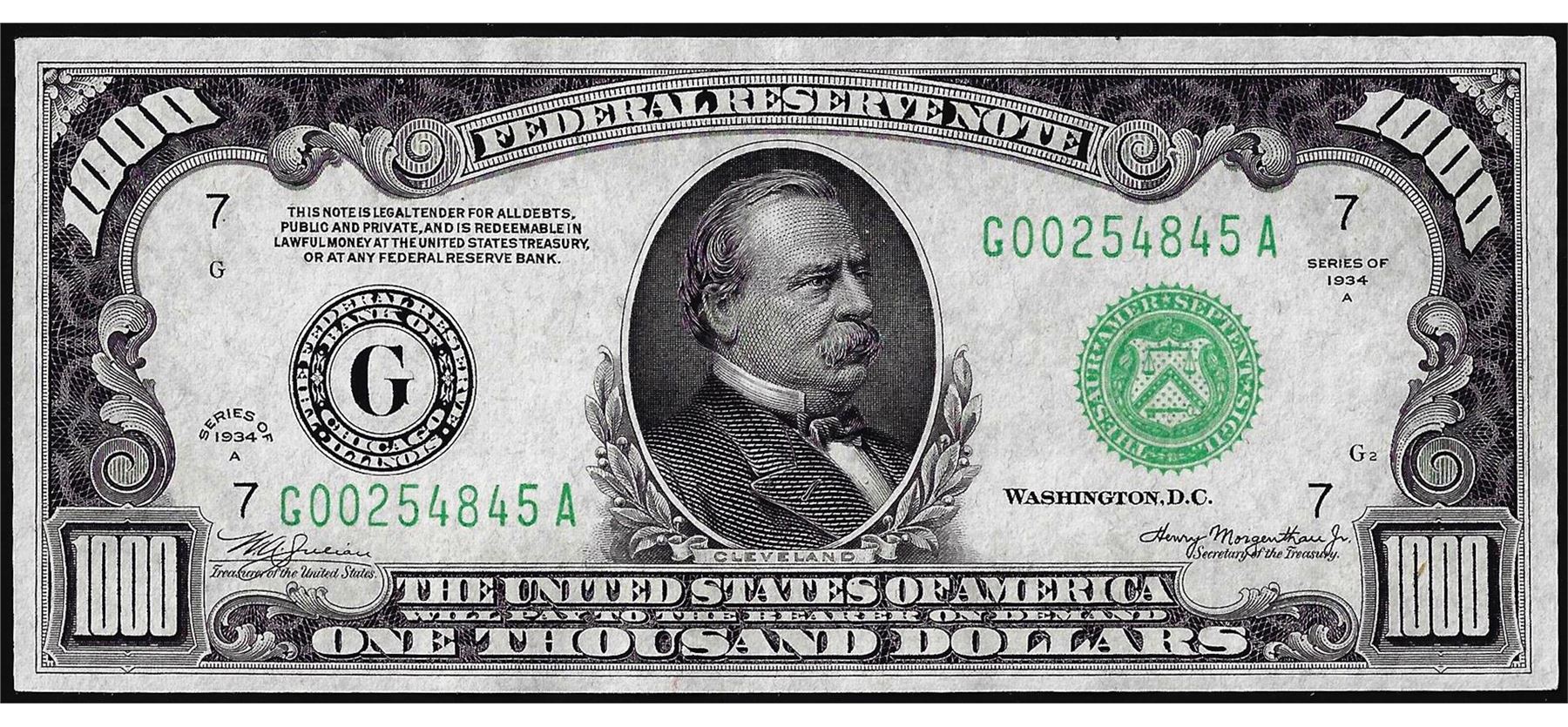 One 1934A $1,000 Federal Reserve Note Chicago.