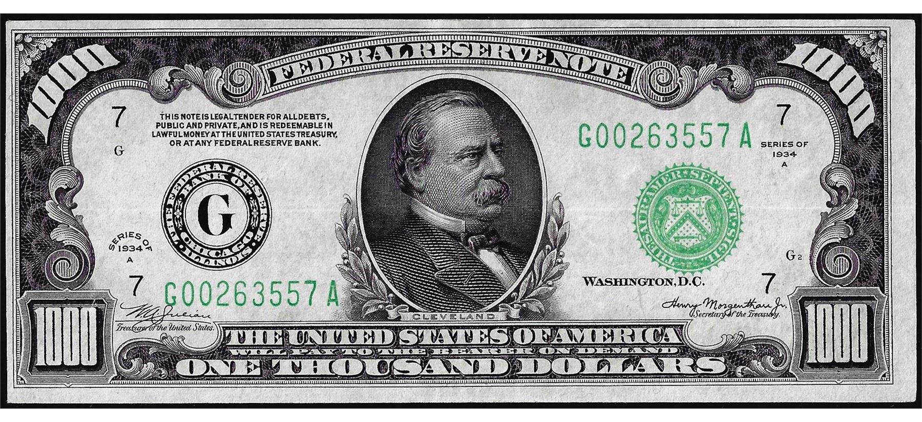 One 1934A $1,000 Federal Reserve Note Chicago.