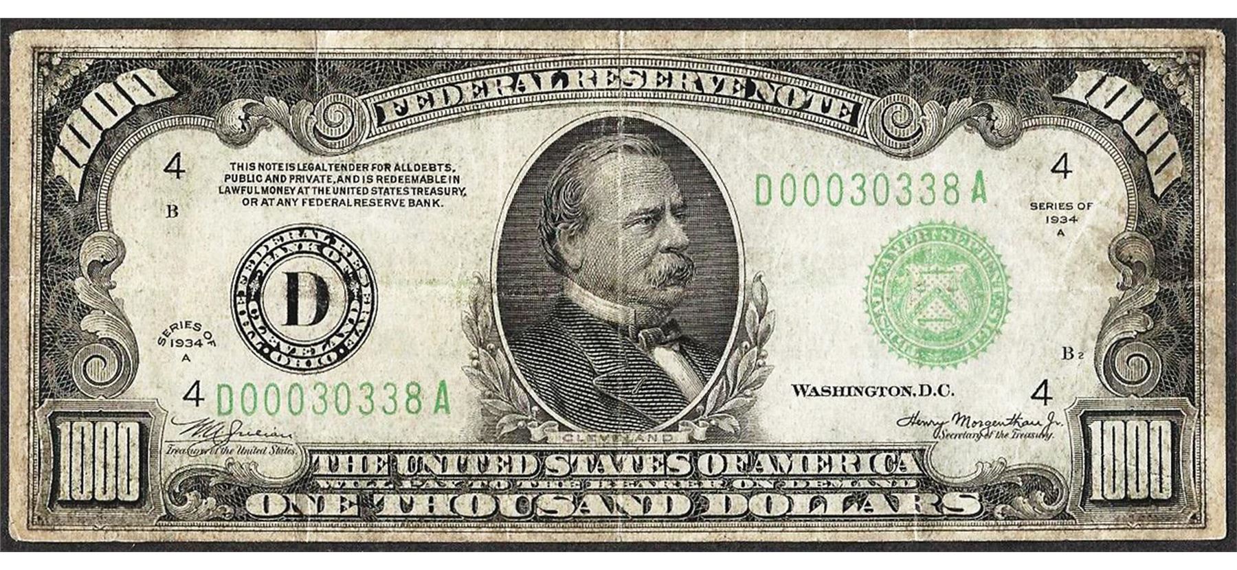 One 1934A $1,000 Federal Reserve Note Cleveland.