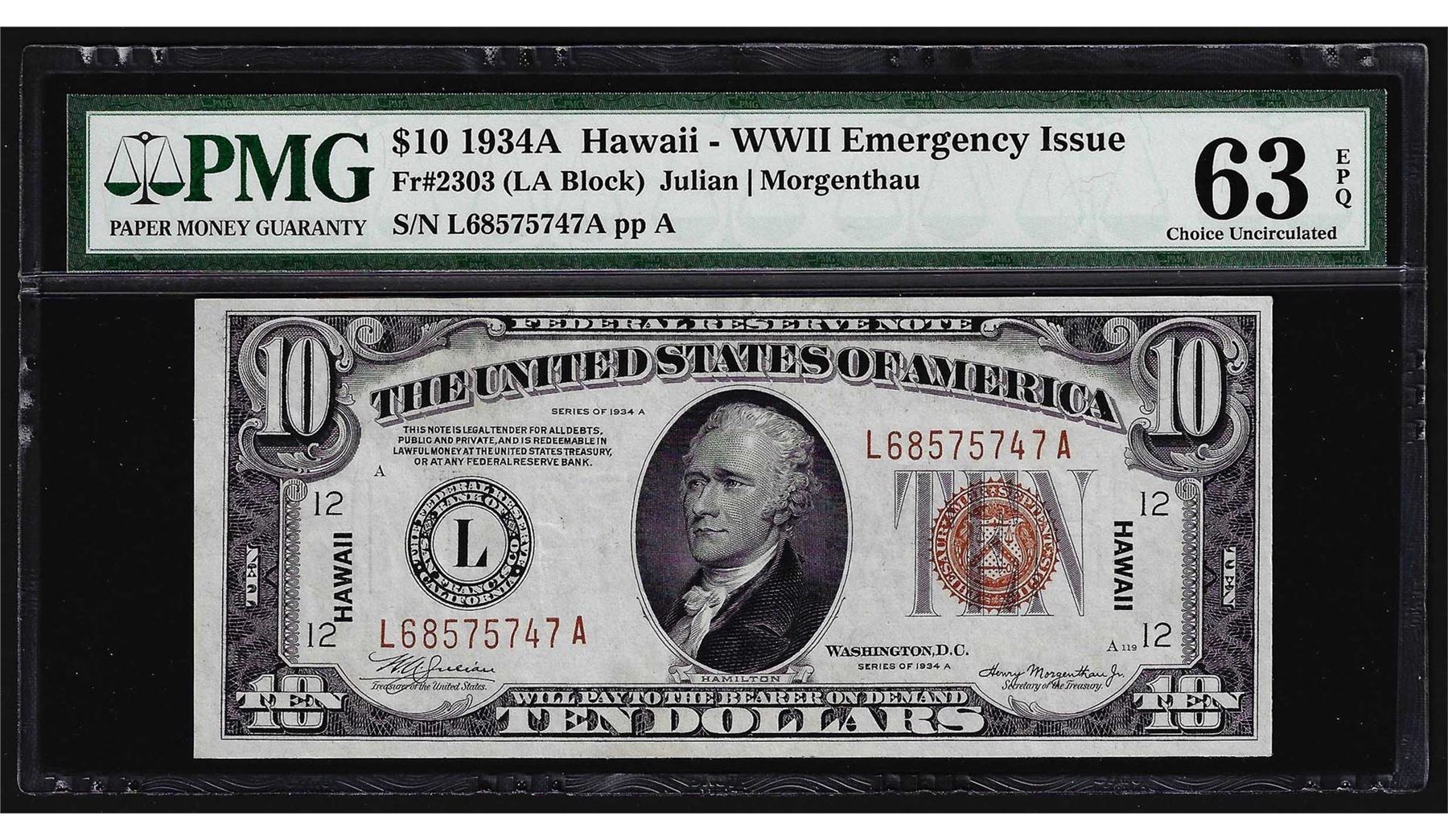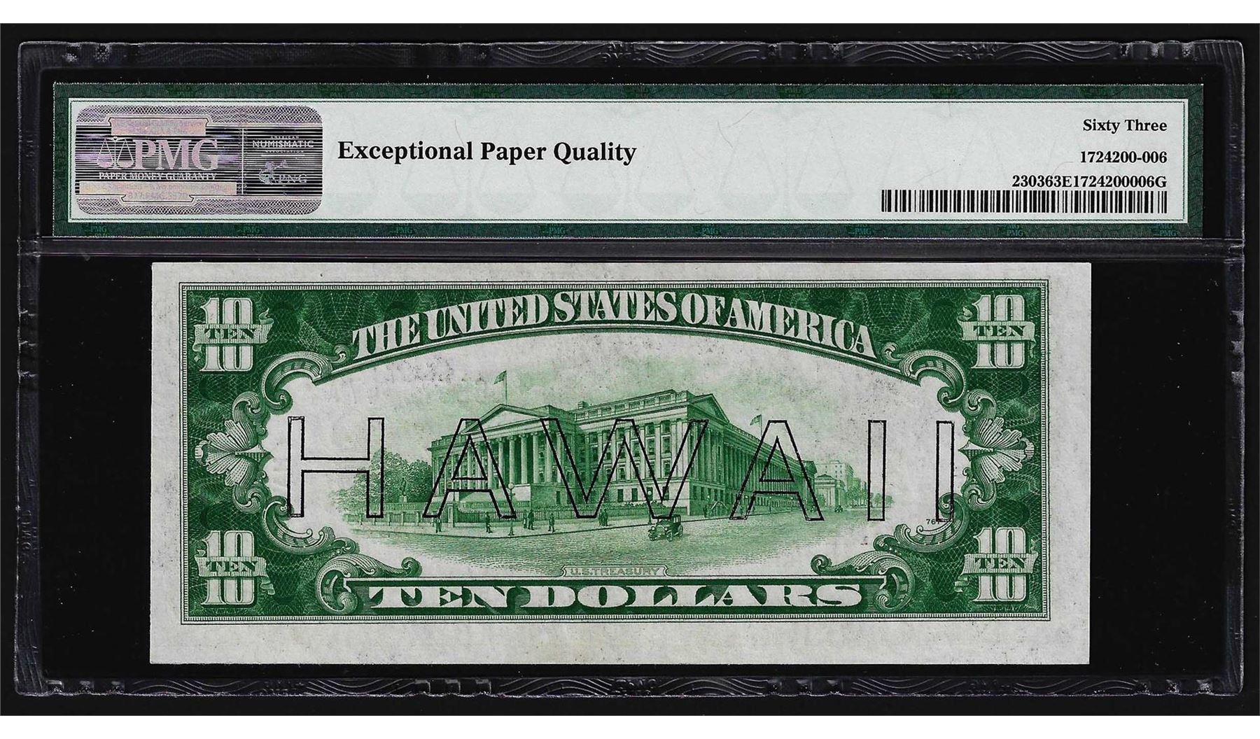 One 1934A $10 Federal Reserve Emergency Hawaii Note PMG Choice Uncirculated 63EPQ. PMG Certified.