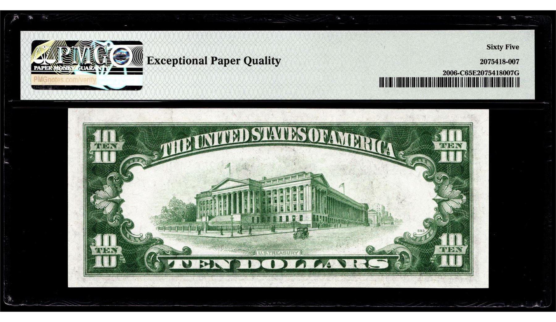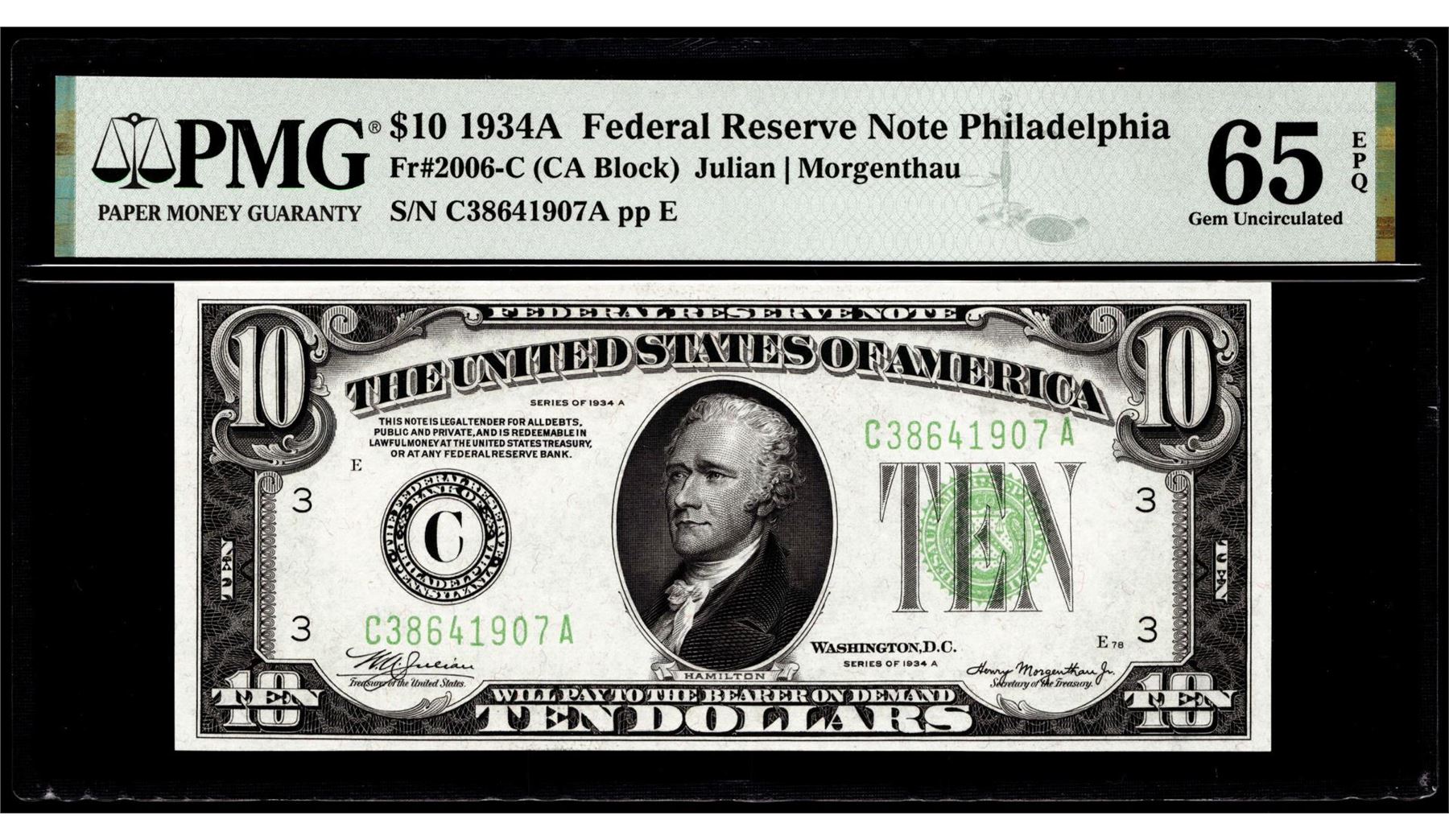 One 1934A $10 Federal Reserve Note Philadelphia Fr.2006-C PMG Gem Uncirculated 65EPQ. PMG Certified.