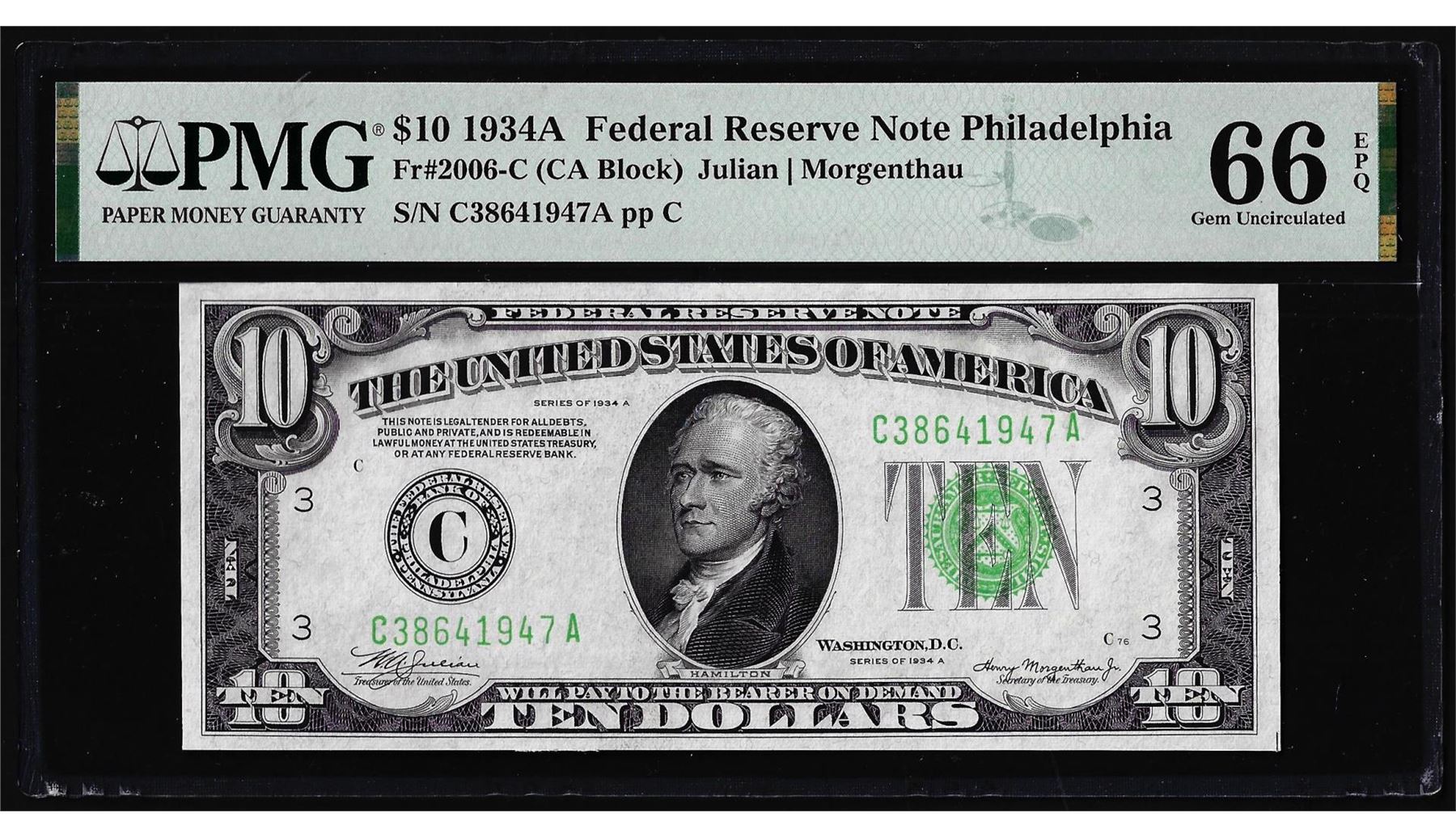 One 1934A $10 Federal Reserve Note Philadelphia Fr.2006-C PMG Gem Uncirculated 66EPQ. PMG Certified.
