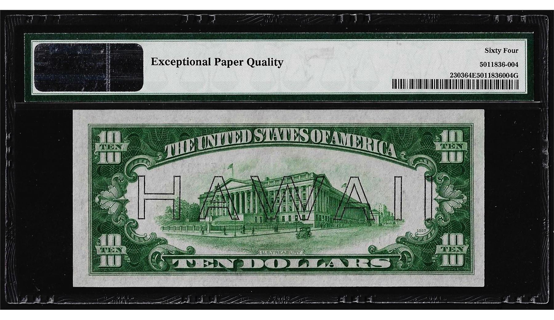 One 1934A $10 Federal Reserve WWII Emergency Hawaii Note Fr.2303 PMG Choice Uncirculated 64EPQ. PMG Certified.