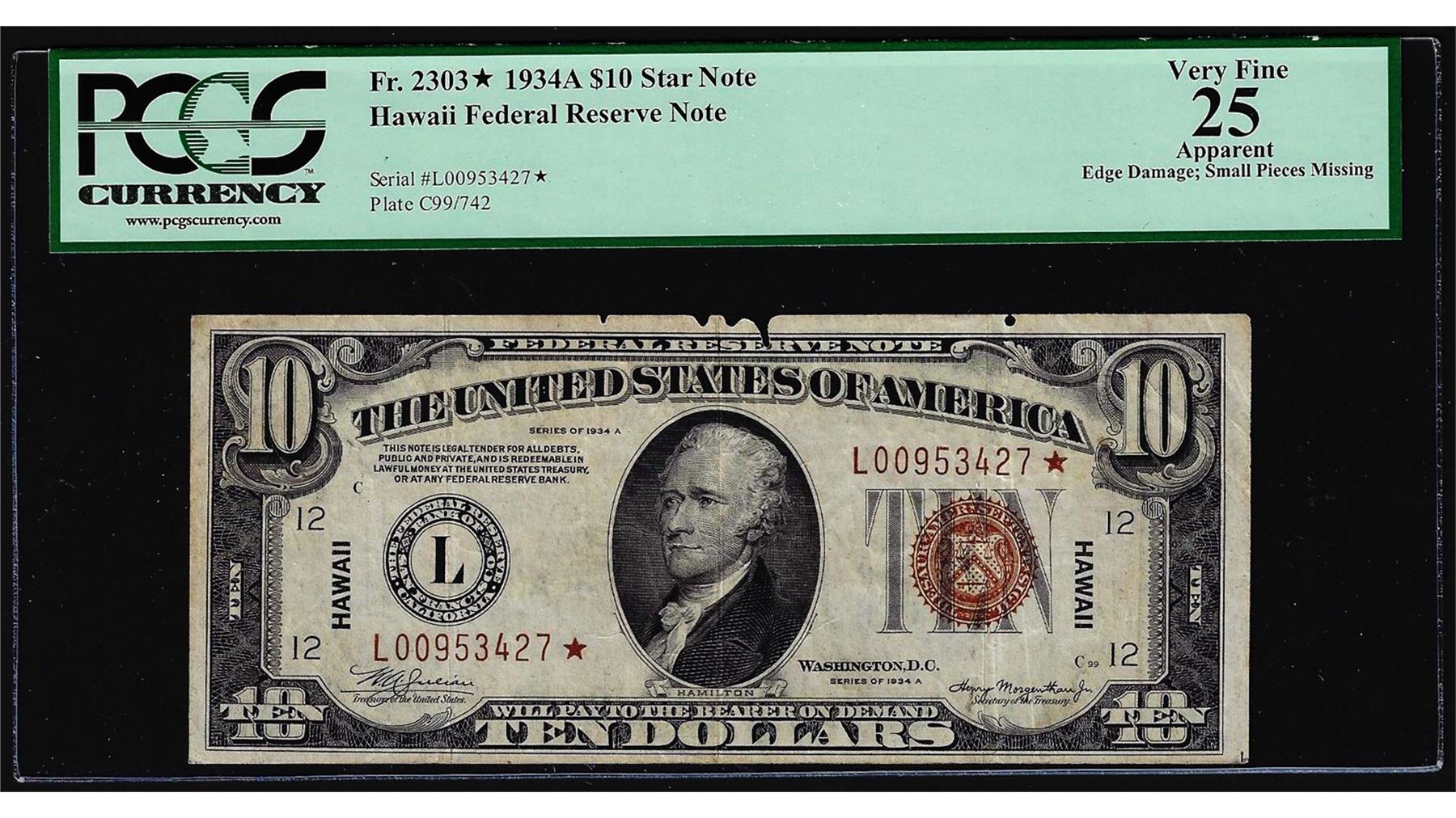 1934A $10 Federal Reserve WWII Emergency Hawaii STAR Note PCGS Very Fine 25 Apparent