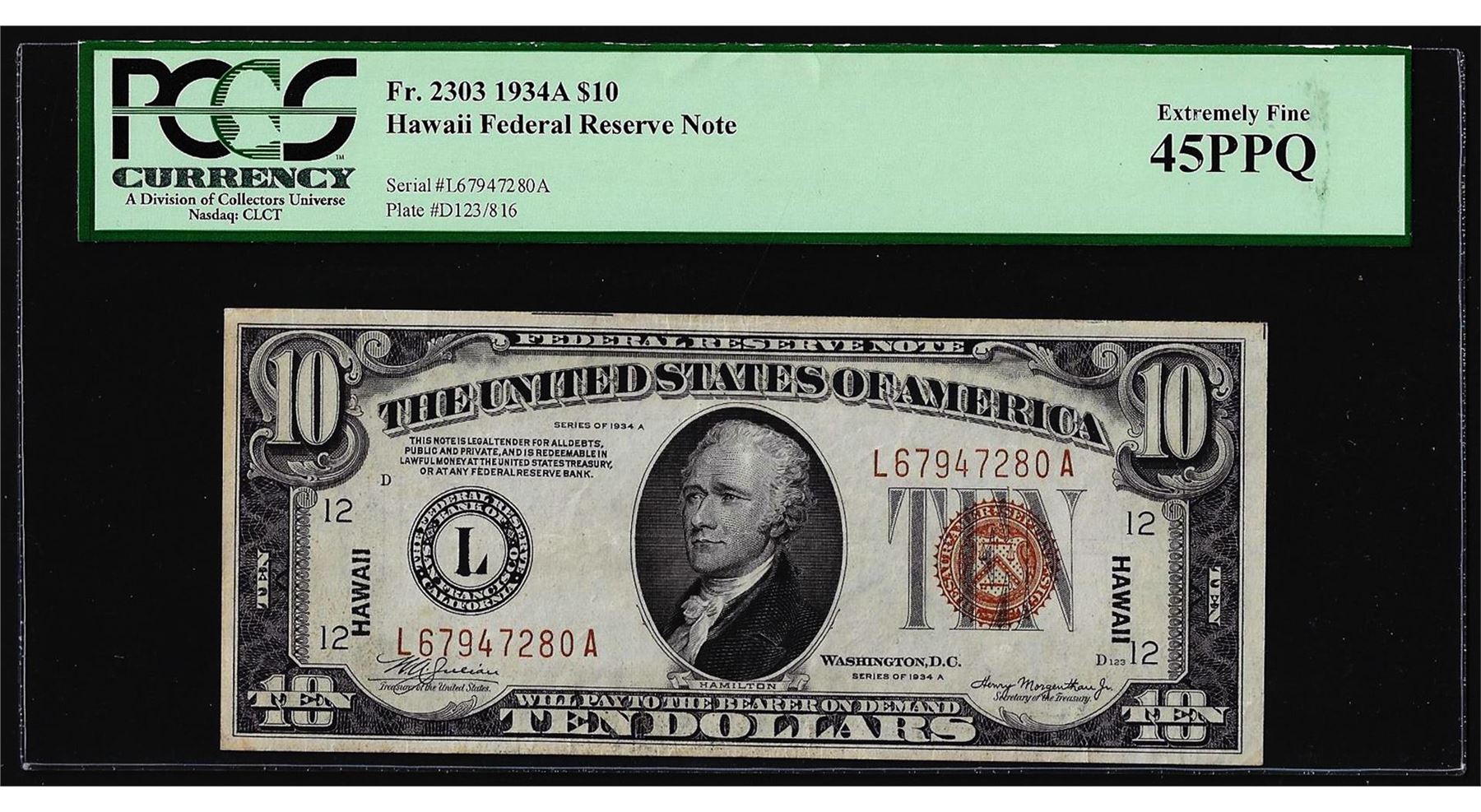 One 1934A $10 Hawaii Federal Reserve Note WWII Emergency Note PCGS Extremely Fine 45PPQ. PCGS Graded.