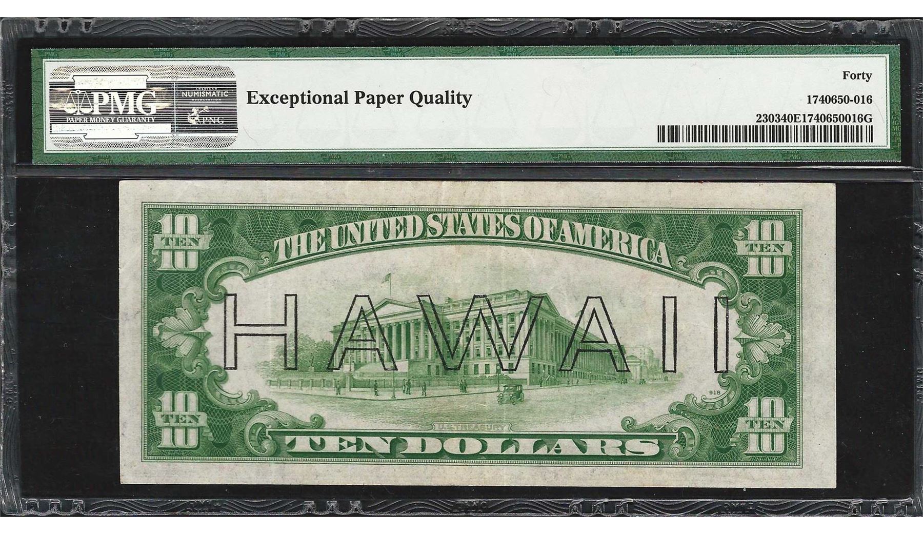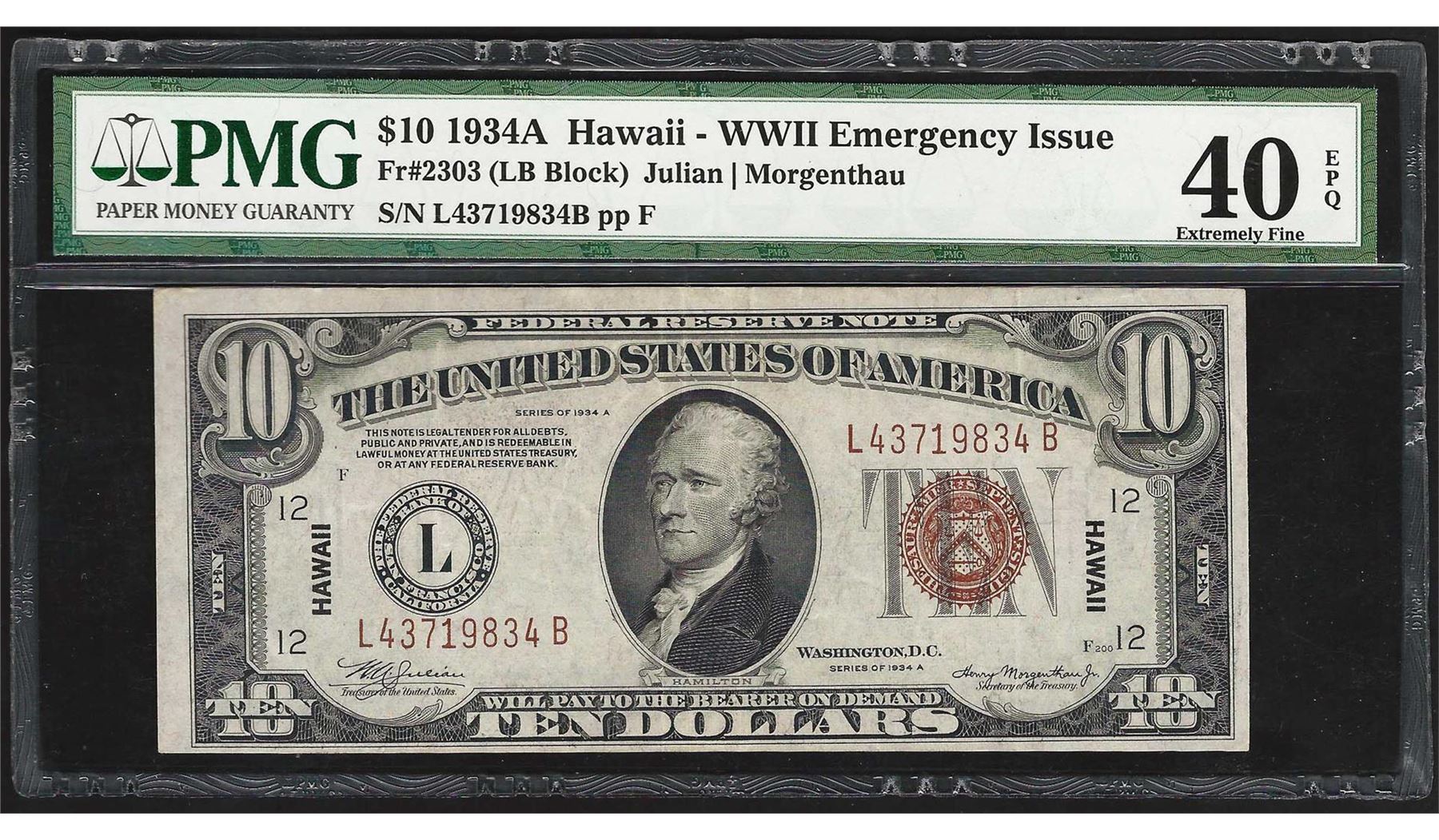 One 1934A $10 Hawaii Federal Reserve WWII Emergency Note PMG Extremely Fine 40EPQ. PMG Certified.