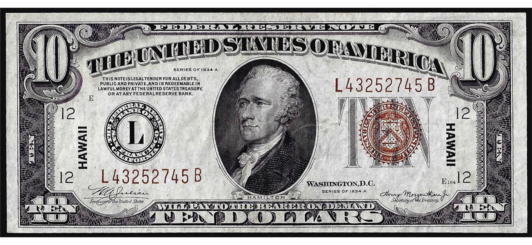 One 1934A $10 Hawaii WWII Emergency Issue Federal Reserve Note.