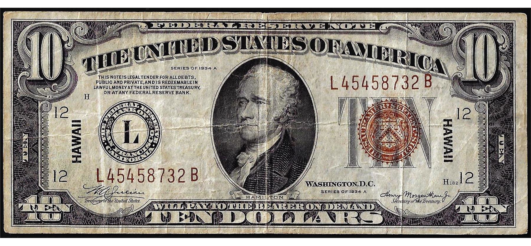 One 1934A $10 Hawaii WWII Emergency Issue Federal Reserve Note.