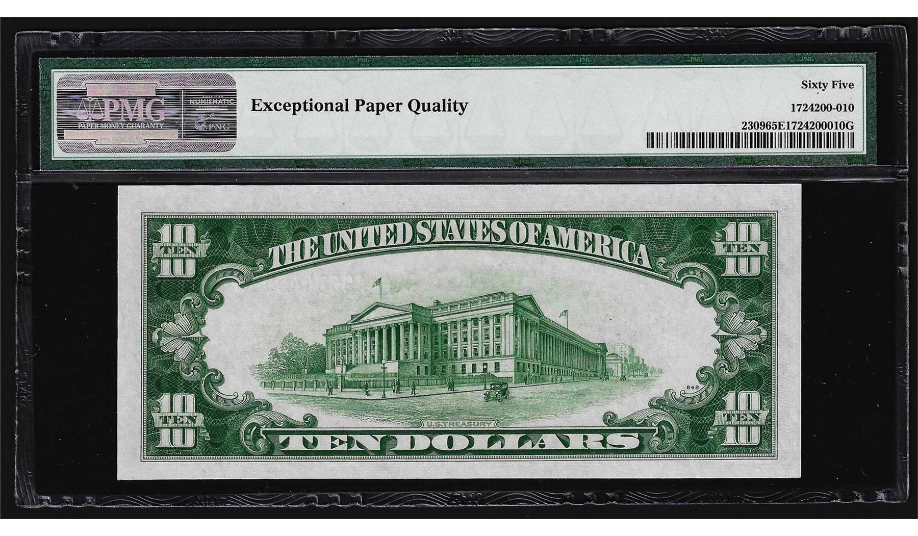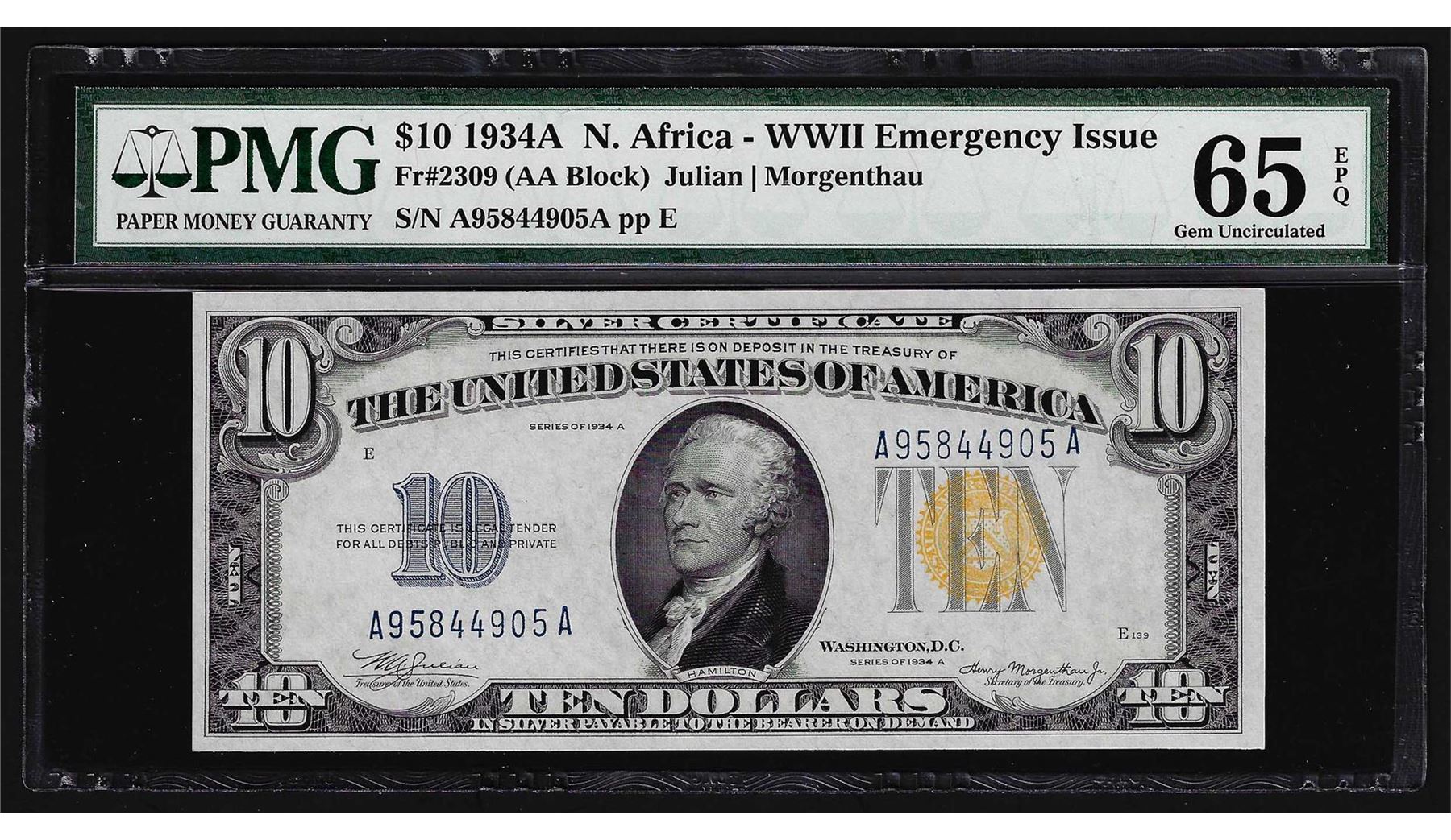 One 1934A $10 North Africa Silver Certificate WWII Emergency Note PMG Gem Unc. 65EPQ. PMG Certified.