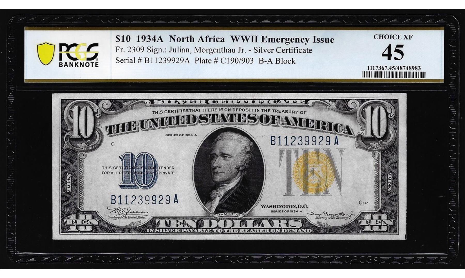 One 1934A $10 North Africa WWII Emergency Issue Note Fr.2309 PCGS Extremely Fine 45. PCGS Graded.