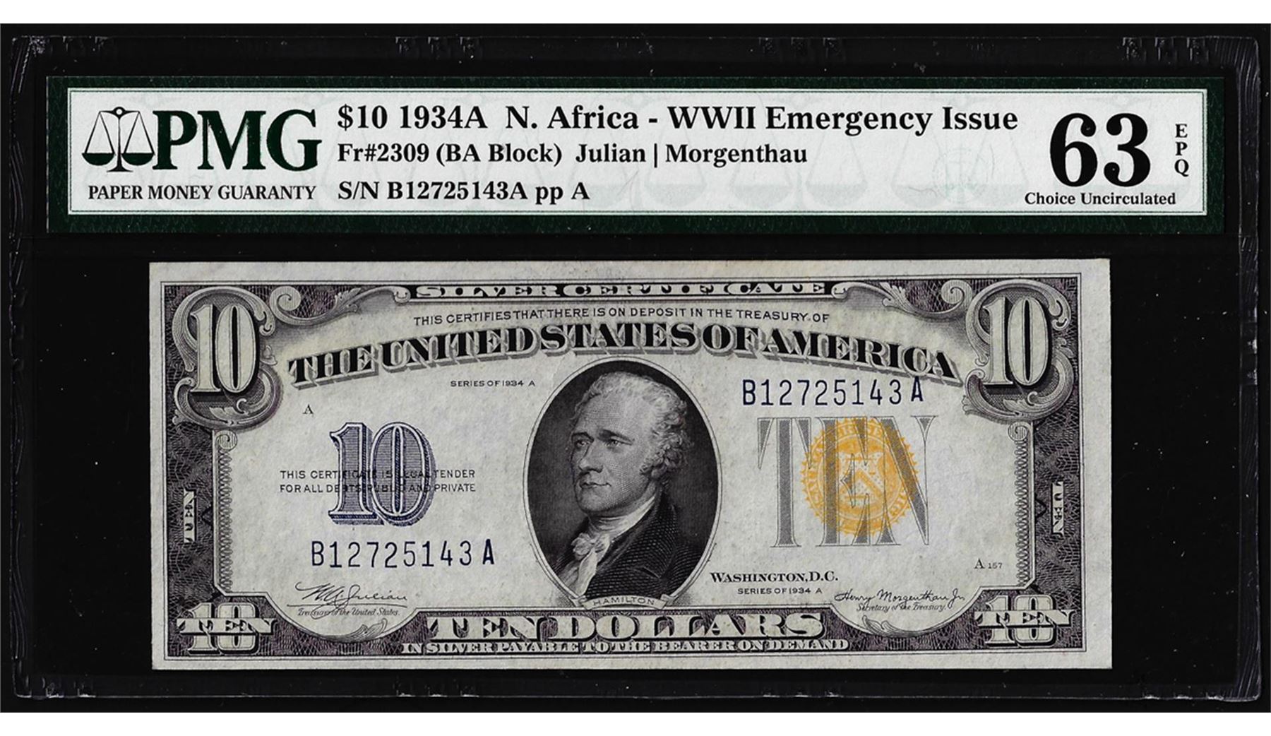 One 1934A $10 North Africa WWII Emergency Issue Silver Certificate Note PMG Ch. Unc 63EPQ. PMG Certified.
